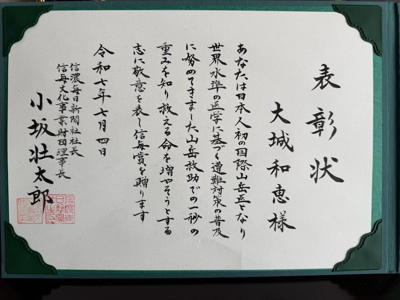 メディア公開 2025.07.31 「信毎賞」を受賞いたしました このたび、山岳医療・救助活動の取り組み、とりわけ長野県での実績をご評価いただき、「信毎賞」を受賞いたしました。これまでの活動が認められたことは大きな喜びであり、多くの方々からのご支えあってこそと深く感謝申し上げます。命と向き合う現場に携わる者として、今回の受賞を励みに、より一層の努力を重ねてまいります。なお、賞金の一部は山岳遭難救助対策のために寄附させていただきました。今後ともご指導ご支援を賜りますようお願い申し上げます。